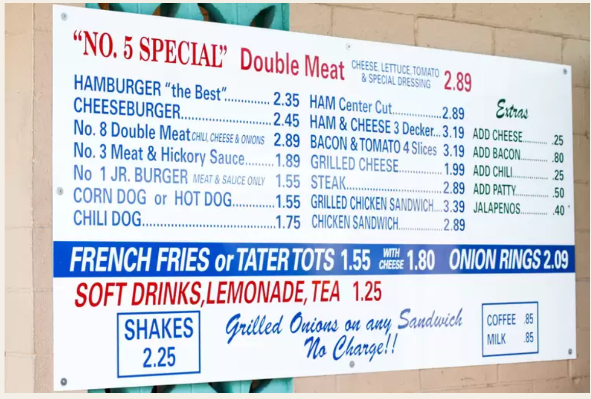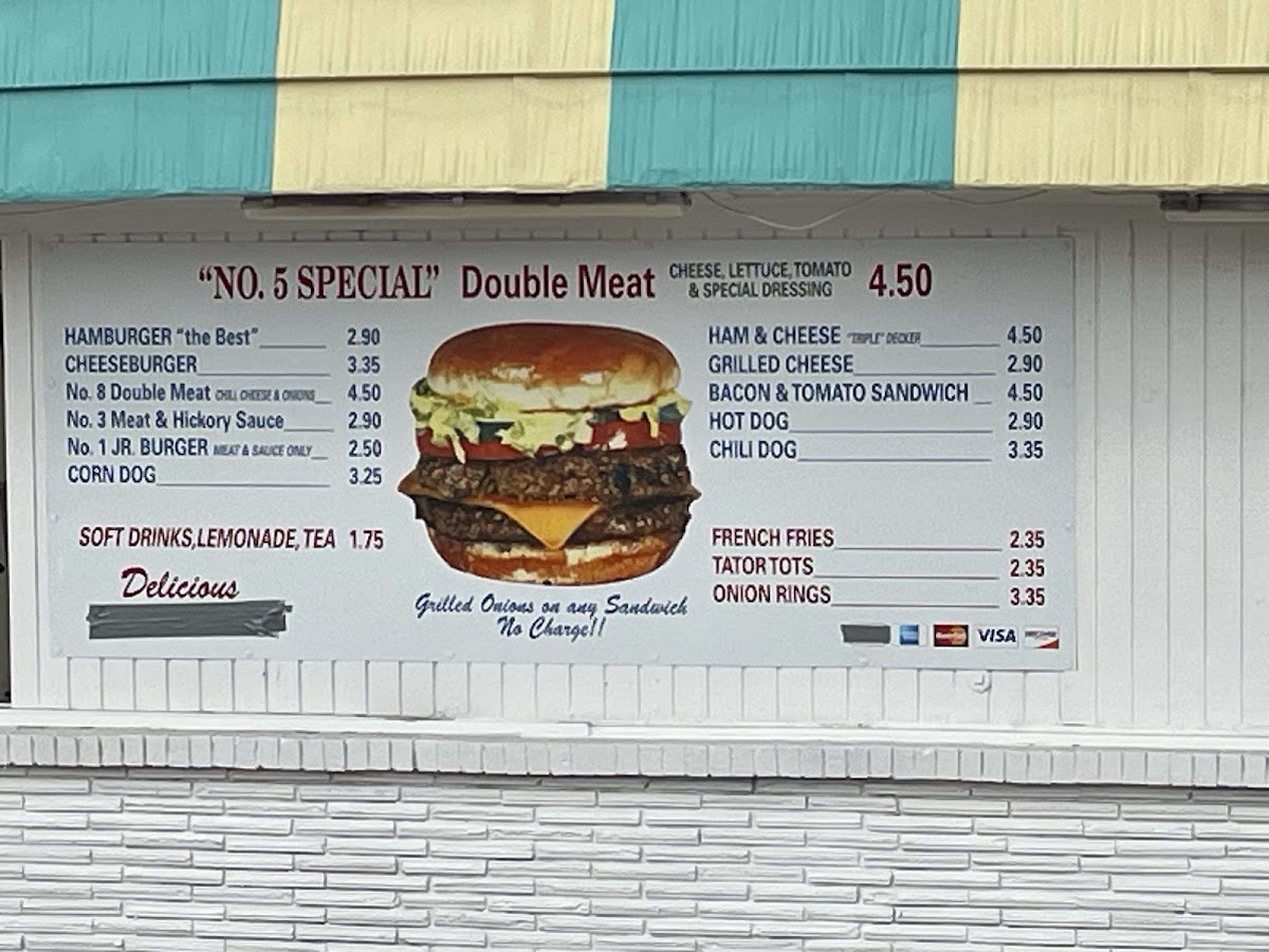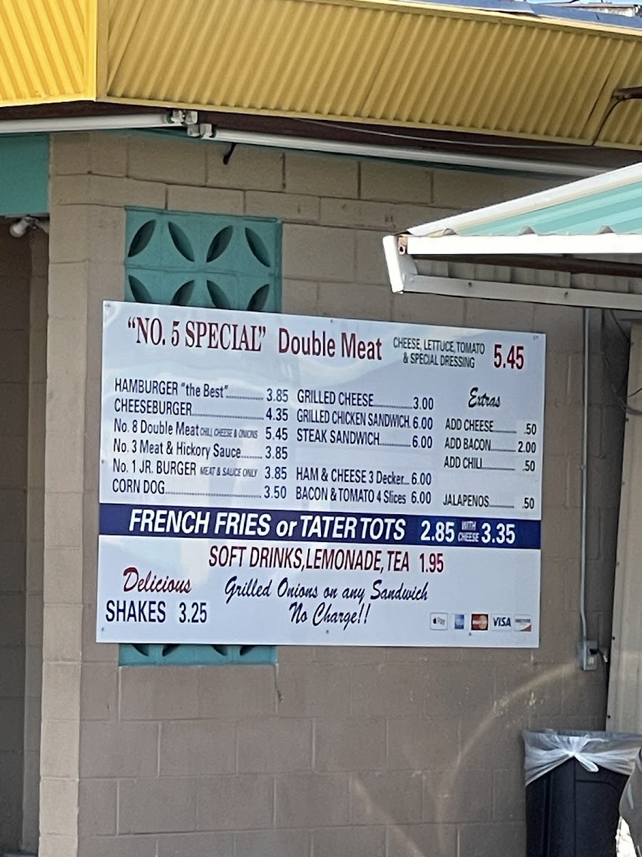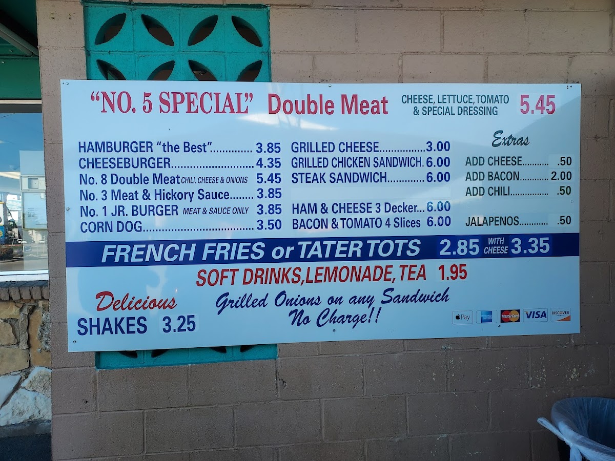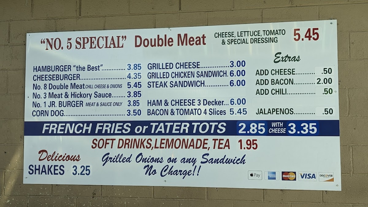 The menu features a variety of classic fast-food items centered around hamburgers and related sandwiches. Visitors can choose from options like standard hamburgers, cheeseburgers, and specialty burgers with various toppings such as chili, cheese, bacon, and hickory sauce. In addition to the main sandwiches, there are hot dogs, corn dogs, grilled cheese, and chicken sandwiches available.